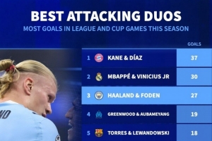 24直播网12月5日讯 德国转会市场统计了本赛季五大联赛进攻端双人组在联赛和杯赛中的进球数量,并列出榜单,凯恩+迪亚斯37球居首,姆巴佩+维尼修斯30球次席。