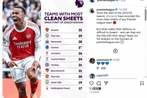 24直播网10月10日讯 根据英超官方的数据统计,自2023-24赛季开始至今,阿森纳零封场次在所有英超球队中排名第一,他们有35场比赛没有丢球。
