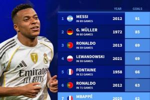 24直播网12月08日讯姆巴佩今年进球已达62球,进入历史前十,德转盘点了足坛历史自然年进球纪录。