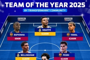 24直播网12月8日讯 德转列出经投票选出的2025年度最佳阵,姆巴佩、亚马尔、贝林厄姆、佩德里在列。