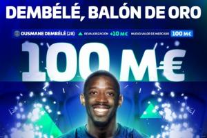 24直播网10月10日讯 德国足球转会市场更新了法甲球员身价,28岁的巴黎前锋登贝莱身价上涨到1亿欧元,自2019年后身价再次突破1亿大关。