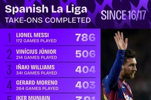 24直播网10月10日讯 Squawka统计了2016-2017赛季以来球员在西甲的成功过人次数,并列出榜单,梅西786次居首,维尼修斯506次第二。