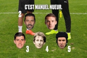 他以倒序列出切赫第5、范德萨第4、库尔图瓦第3、布冯第2,最终将诺伊尔评选为第1。
