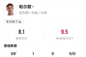 24直播网12月14日讯 2025-26赛季英超联赛第16轮,切尔西主场迎战埃弗顿。帕尔默首发出战,1次射门1次射正打进1球,送出2次关键传球,评分8.1。