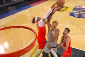 文班亚马过人冲击篮筐,多特杀出来盖掉!