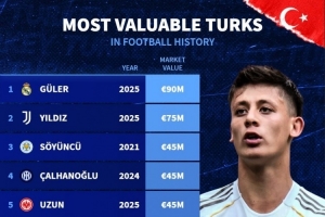 24直播网12月14日讯 德国转会市场列出了土耳其球员历史身价排名,居莱尔9000万欧居首,伊尔迪兹7500万欧次席。