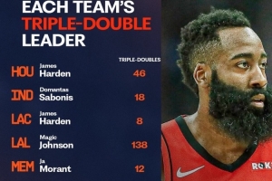 24直播网12月16日讯 国外自媒体Enjoy Basketball统计了NBA各队队史上拿到三双最多的球员。