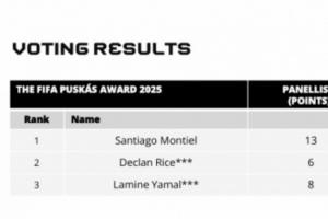 根据国际足联官方公布的票数统计结果,蒙铁尔以21分位列第一,赖斯和亚马尔同积17分分列二三,官方仅给出了前三名的投票结果。