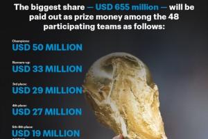 24直播网12月18日讯 国际足联官方昨日公布2026世界杯的奖金分配方案,奖金总额7.27亿美元,冠军奖金5000万美元,参赛即可拿1050万美元。