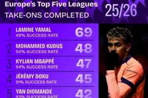 24直播网12月18日讯 数据机构squawka统计了本赛季五大联赛成功过人情况,巴萨边锋亚马尔独自领跑。