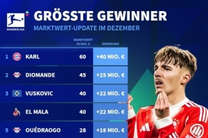 24直播网12月19日讯 德国转会市场列出了德甲球员身价上涨排名,卡尔上涨4000万欧居首。