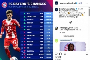 24直播网12月19日讯 德转公布了拜仁球员的身价变化,其中,小将伦纳特·卡尔的身价上涨了4000万欧元,来到6000万欧元,凯恩和穆西亚拉的身价都下降了1000万欧元。