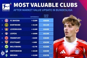 24直播网12月19日讯 《转会市场》在今日更新了德甲球员身价,也统计了德甲各队的最新身价情况。