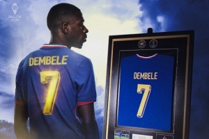 24直播网12月20日讯 据法国足协官方在线商店显示,为庆祝登贝莱荣获2025年金球奖,官方推出了一款极其珍贵的联名收藏品,带有独家金色印字的登贝莱装裱球衣。