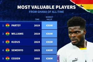 24直播网10月13日讯 德国转会市场列出加纳球员历史最高身价排名,托马斯、伊纳基-威廉姆斯、库杜斯5000万欧居首。