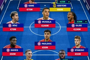 中场:路易斯-迪亚斯(拜仁慕尼黑,7000万欧元)、帕夫洛维奇(拜仁慕尼黑,5500万欧元)、穆西亚拉(拜仁慕尼黑,1.4亿欧元)、奥利塞(拜仁慕尼黑,1.3亿欧元)